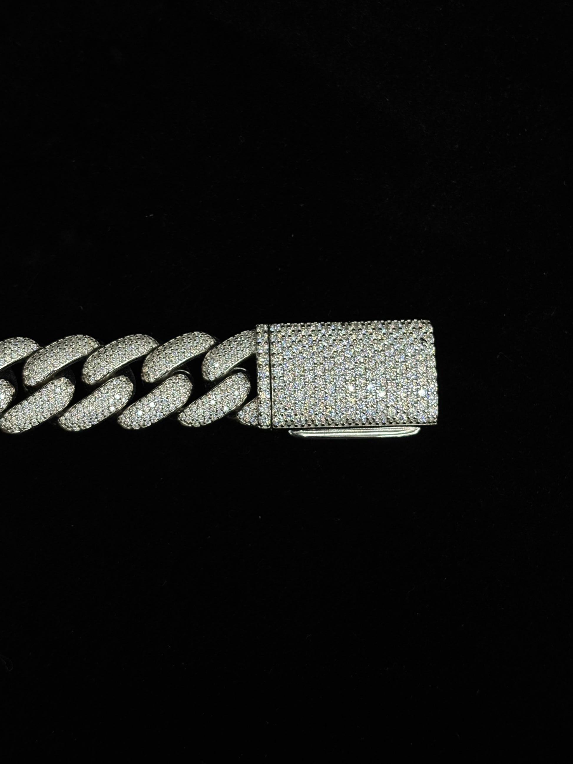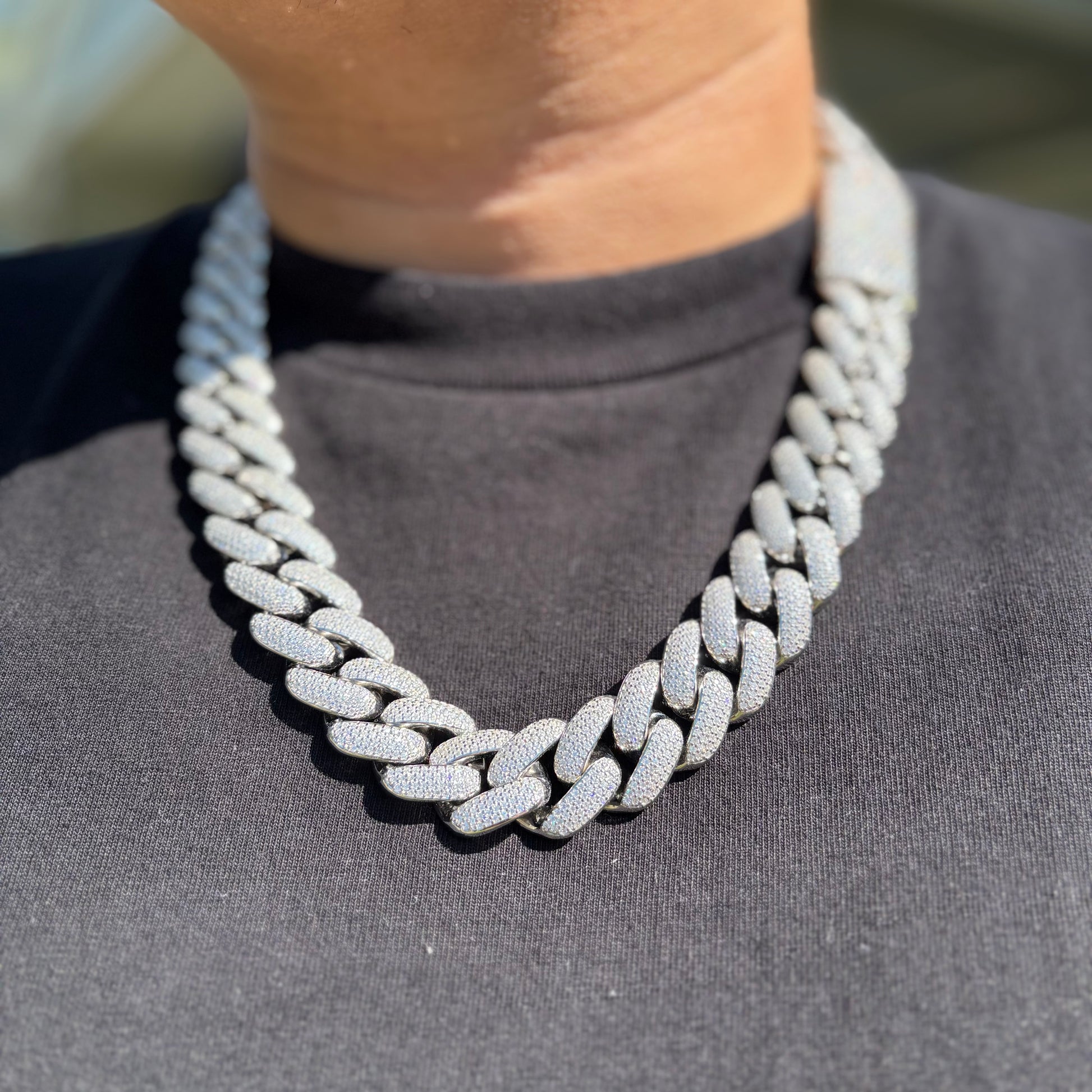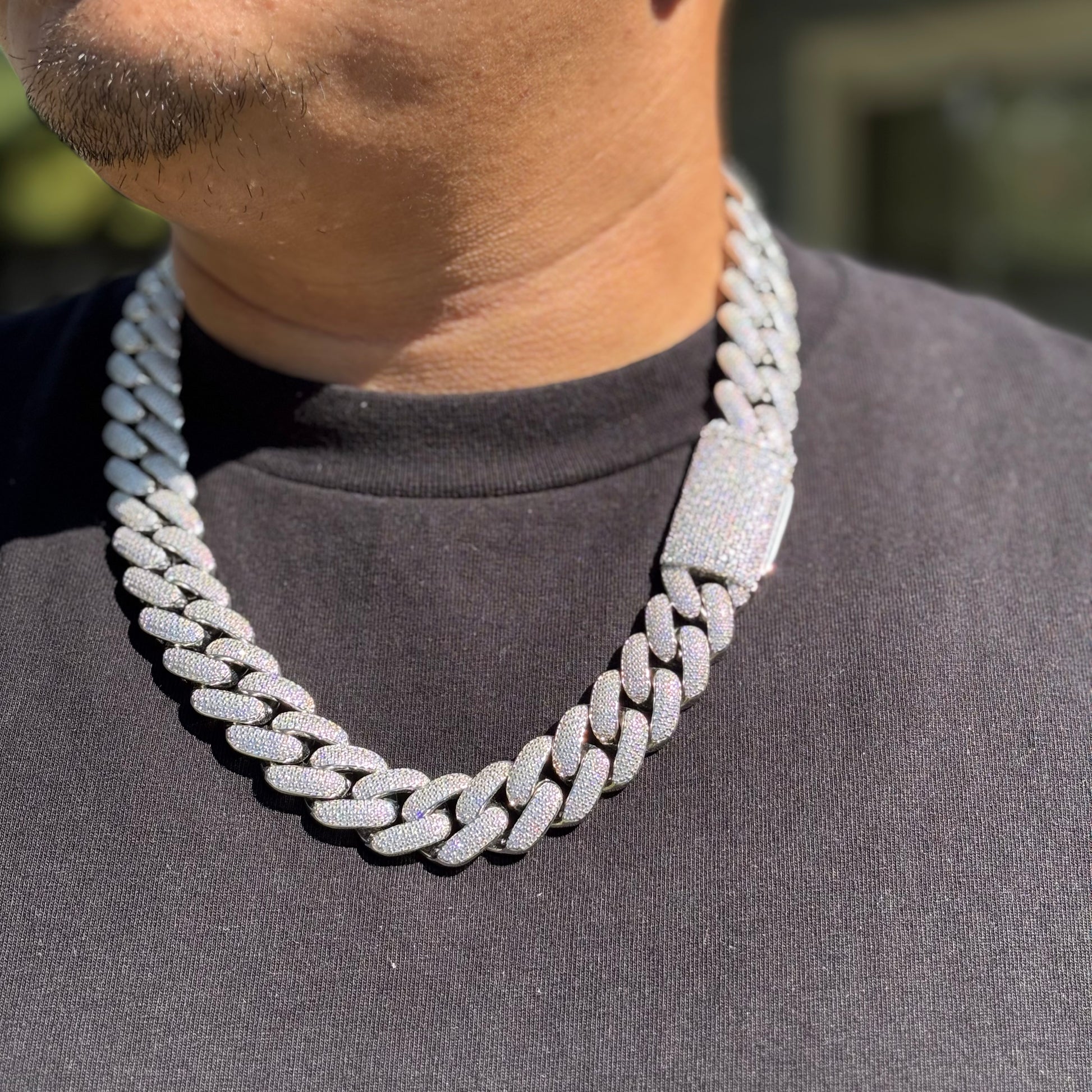 Heavy weight for the heavy hitters. This chain features over 57 Ct of VVS Clarity moissanite with a breathtaking honeycomb setting into a solid .925 Silver Cuban link chain. The lock ensures a secure link when the clasp is closed for anytime, anywhere use.