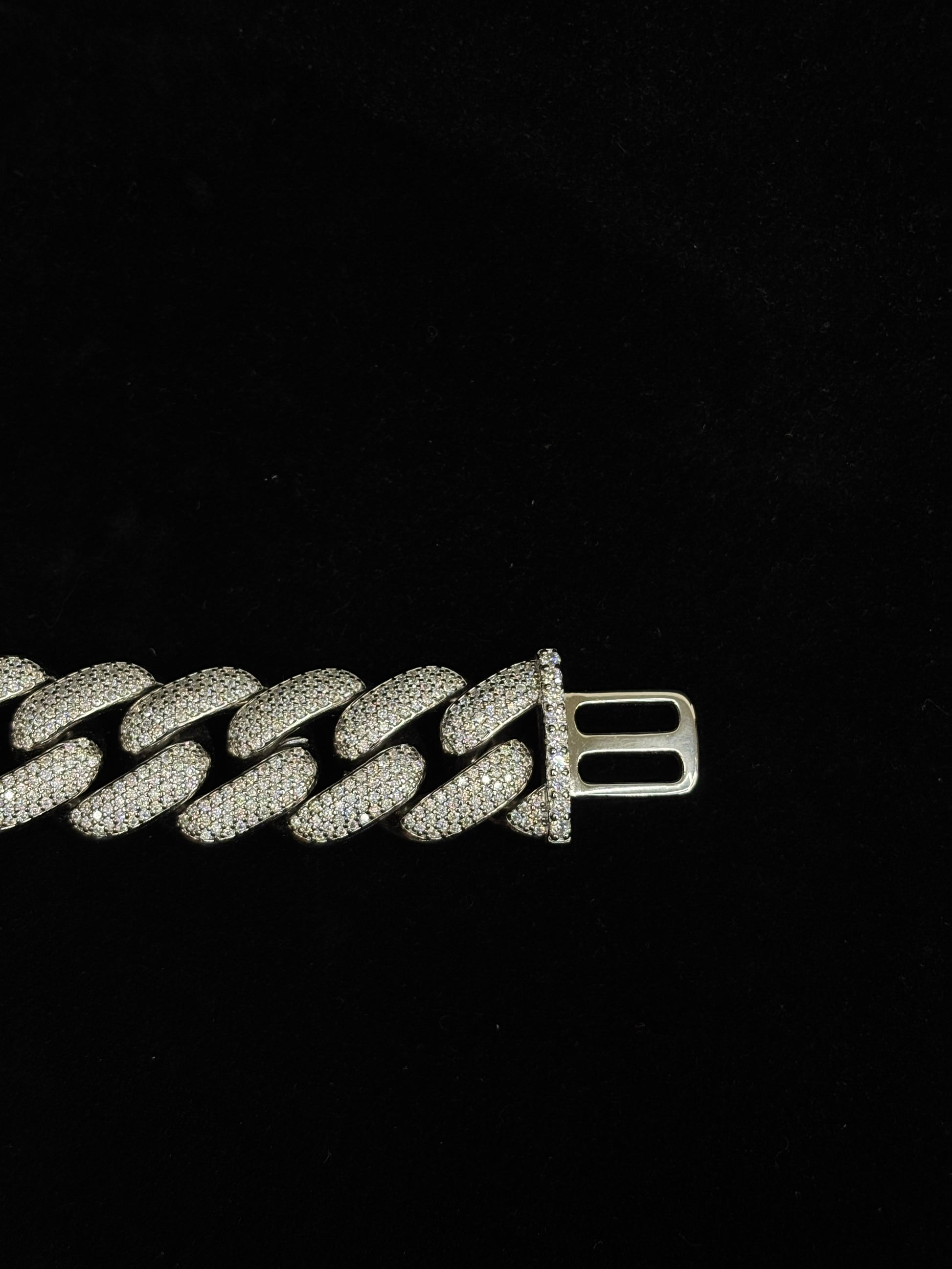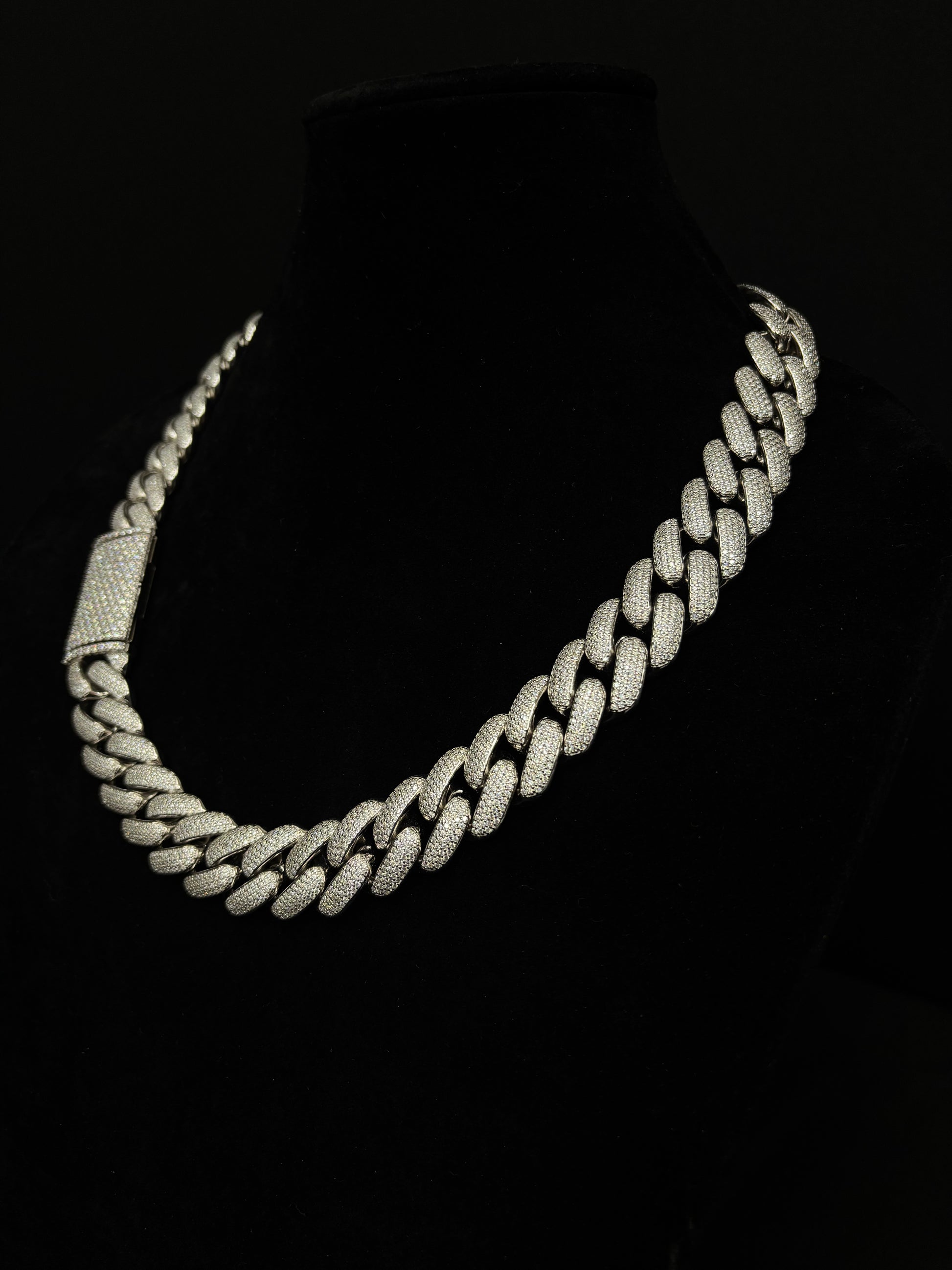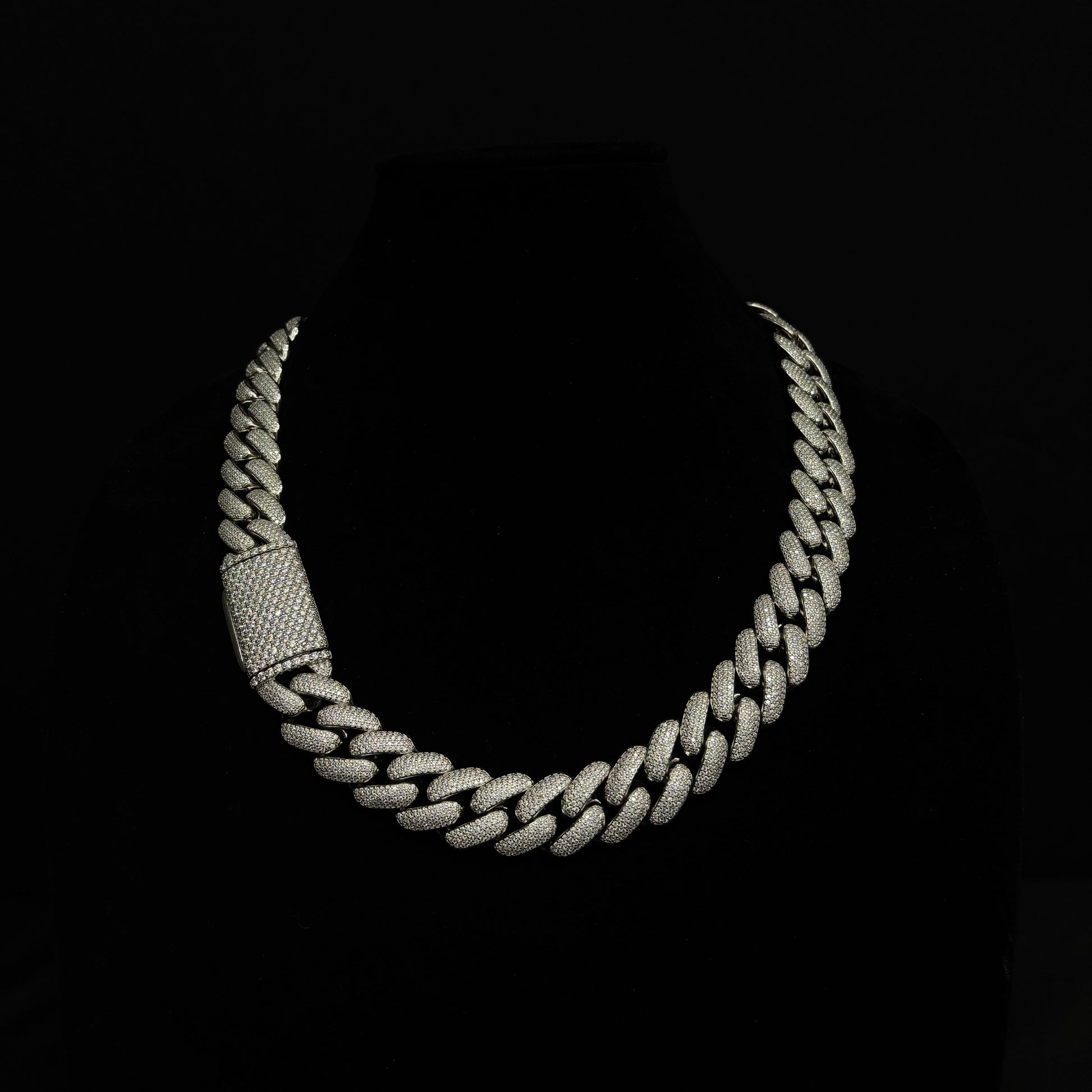 Heavy weight for the heavy hitters. This chain features over 57 Ct of VVS Clarity moissanite with a breathtaking honeycomb setting into a solid .925 Silver Cuban link chain. The lock ensures a secure link when the clasp is closed for anytime, anywhere use.